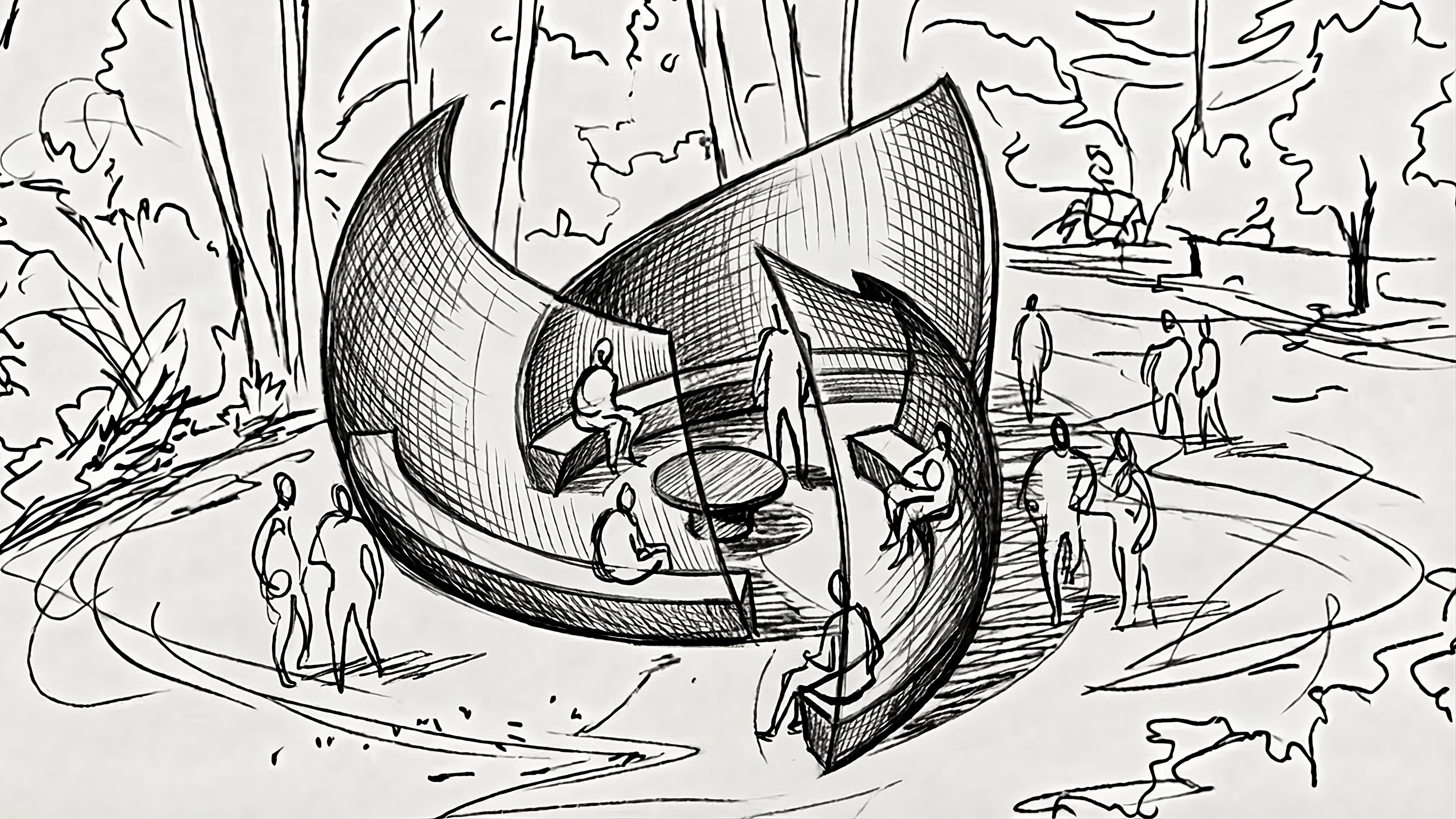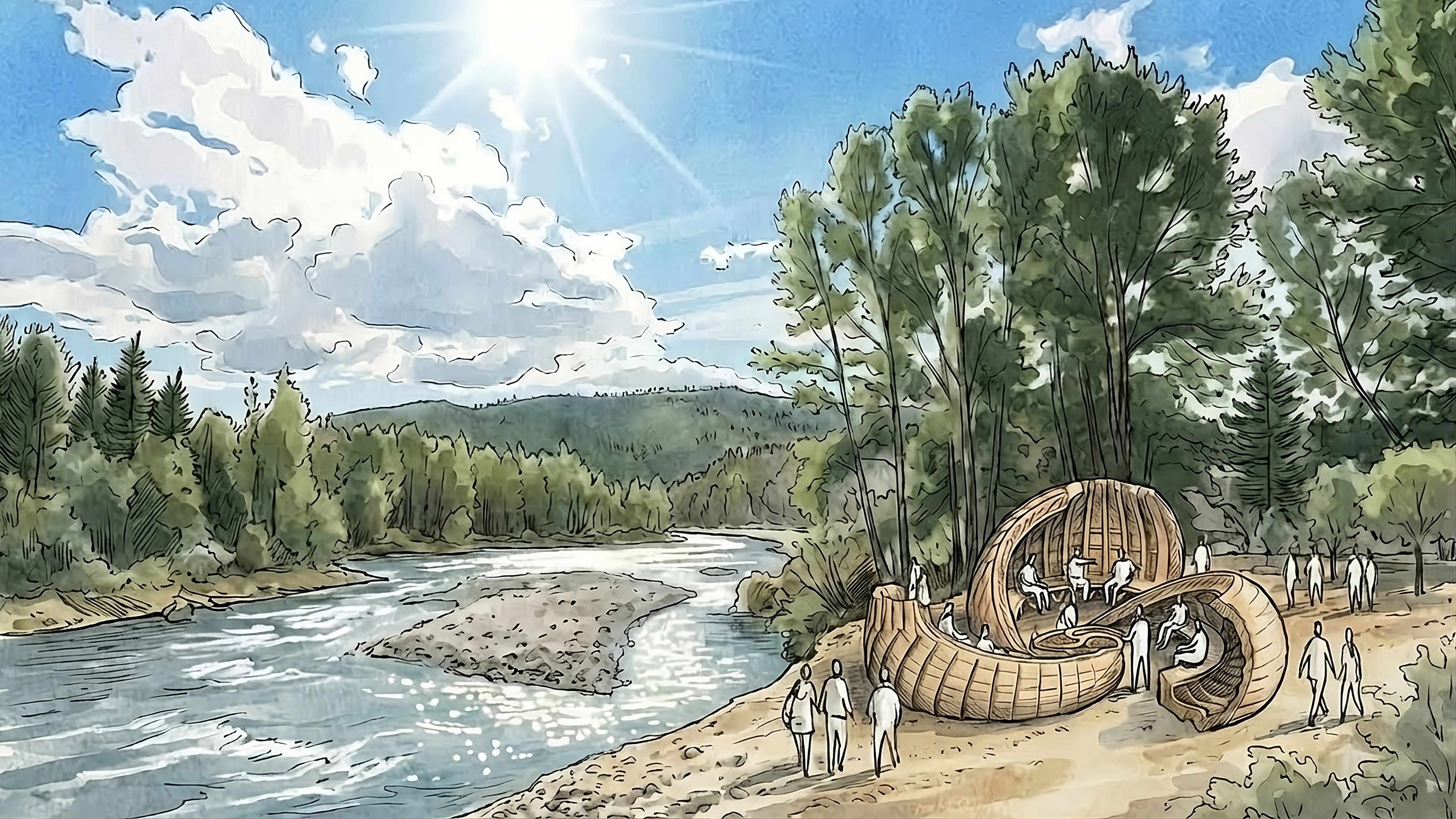 In the shelter of the forest, where light falls softly through cedar and fir, a temple unfolds - not outward into spectacle, but inward toward stillness. Born from the Korean symbol of Sam Tae Guk, the threefold harmony of Sky, Humanity, and Earth, this pavilion translates cosmic balance into an intimate refuge. Three wings spiral from a shared center, each a chamber of elemental presence: one reaching skyward into air and imagination, another gathering the warmth of human connection, the third settling into grounded rest. Together they form a vessel that both shields and reveals, protecting those who enter while the central light installation casts its quiet glow through screened wood walls, painting each wing in turn with the radiance of sky, humanity, and earth.
